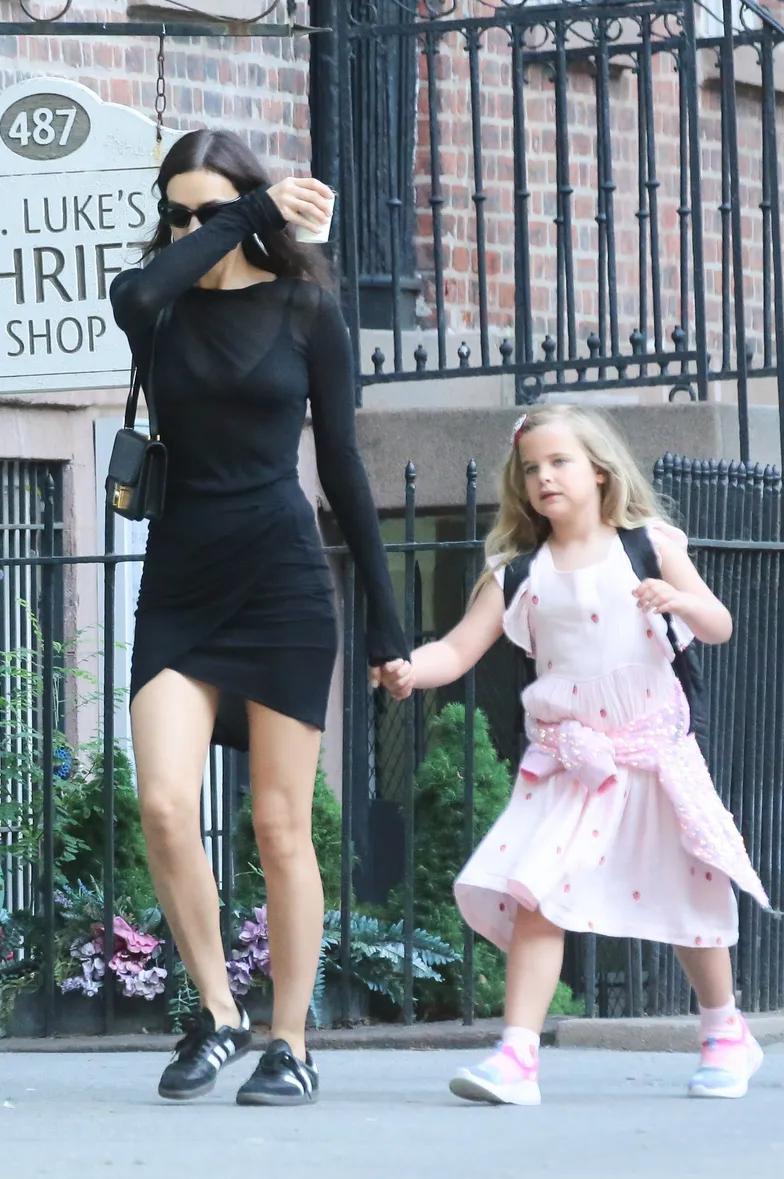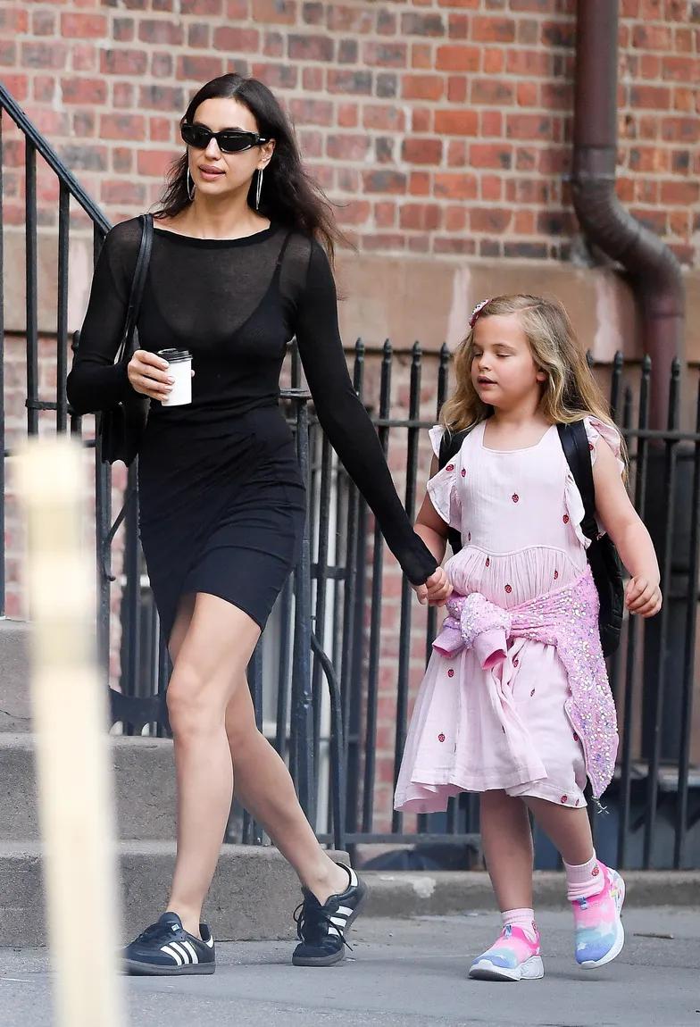 На этот раз русская красавица вышла в город в черном «total луке». Стиль Ирины Шейк состоял из платья длиной до середины бедра в сочетании со спортивной обувью и узкими солнцезащитными очками. Пригодилась и небольшая сумочка, с помощью которой модель пряталась от вездесущих папарацци. В свою очередь, дочь 38-летней модели, которая несла на спине гигантский рюкзак, была одета в розовое платье. Девичий стиль Леи дополнили яркие спортивные туфли.