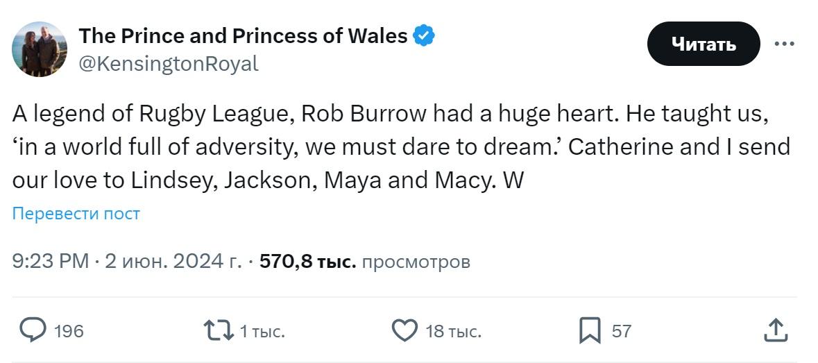 На этот раз он объявил о смерти бывшей звезды регби Роба Берроу, который несколько лет боролся с заболеванием двигательных нейронов. Мужчина умер в возрасте 41 года. В записи принц также кратко упомянул свою жену.