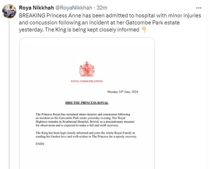 Принцесса Эдинбургская получила легкие травмы и сотрясение мозга в результате инцидента в поместье Гэткомб-Парк вчера вечером. Её Королевское Высочество остается под наблюдением в больнице Саутмид в Бристоле в качестве меры предосторожности и, как ожидается, вскоре полностью выздоровеет. Король находится в курсе и передает принцессе самые теплые пожелания и пожелания скорейшего выздоровления