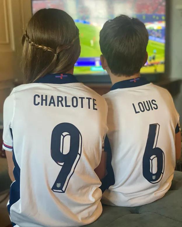 Англия, ваше решимость и настойчивость вдохновили всех нас, молодых и старых. Поздравляем Испанию. W&C — читаем рядом с фотографией, на которой изображены принц и принцесса в футбольных футболках. Шарлотта имела число 9, а Людовик — 6 (цифры, скорее всего, соответствовали возрасту принцессы и принца).
